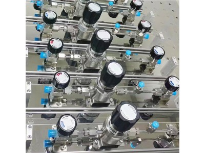 高纯特气供气管路系统,是将高纯气体、特种气体、电子气体等多种瓶装气体汇集到高压管路中,进行减压、稳压并输送到用气终端的整体供气设备,主要由气体钢瓶、不锈钢减压器、高压防爆软管、高压截止阀、自动切换装置、压力表等相关附件组成。主要适用于实验室、电子制造、化工、食品、航空航天等多个领域。